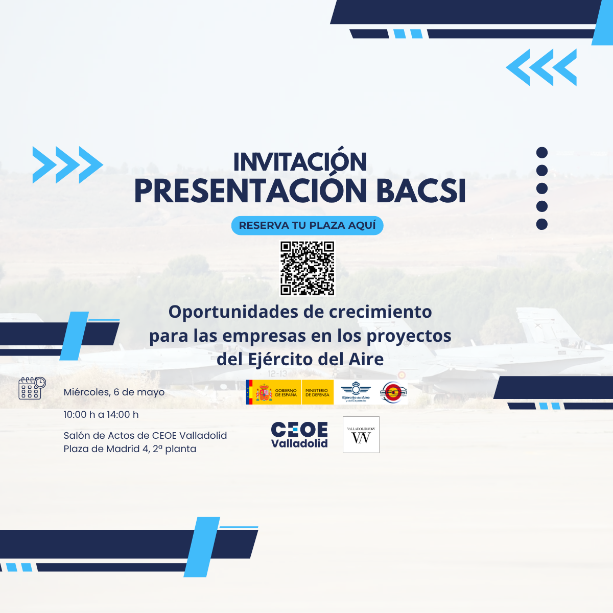 La jornada tendrá lugar en el salón de actos de CEOE Valladolid, de 10:00 a 13:00 horas, y permitirá conocer de primera mano el contexto actual del Ejército del Aire en Valladolid, el papel de la Base Aérea de Villanubla y los objetivos y líneas de actuación del proyecto BACSI.