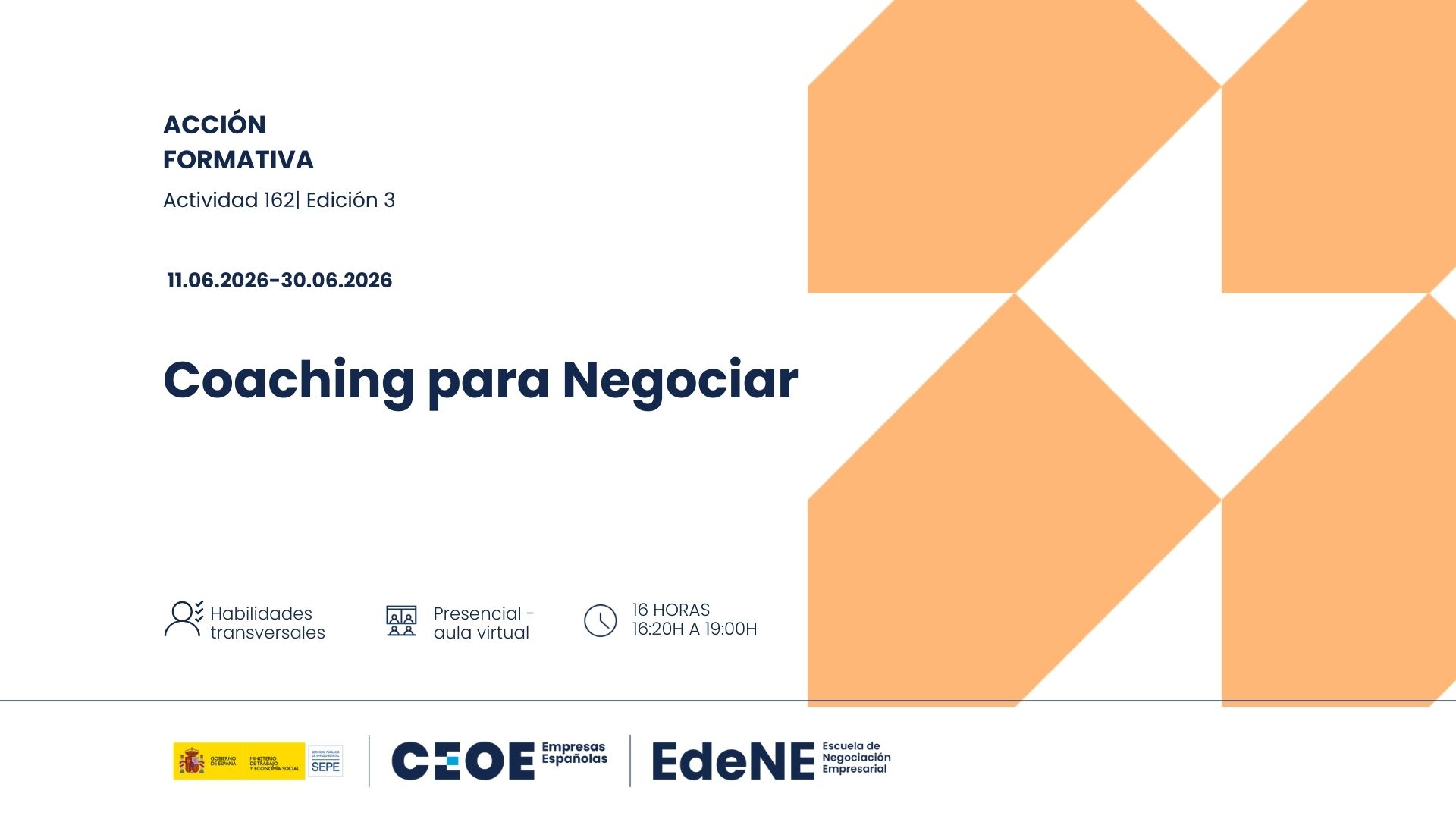 Curso de Coaching para Negociar 23 febrero, 2026 CEOE VA EDICIÓN 3. Información aquí. Solicitud aquí. Información: ACCION: 162 GRUPO: 3 FECHA DE INICIO: 11/06/2026 FECHA FIN: 30/06/2026 HORARIO: 16:20 A 19:00 DIAS DE IMPARTICION: JUNIO: 11-16-18-23-25-30