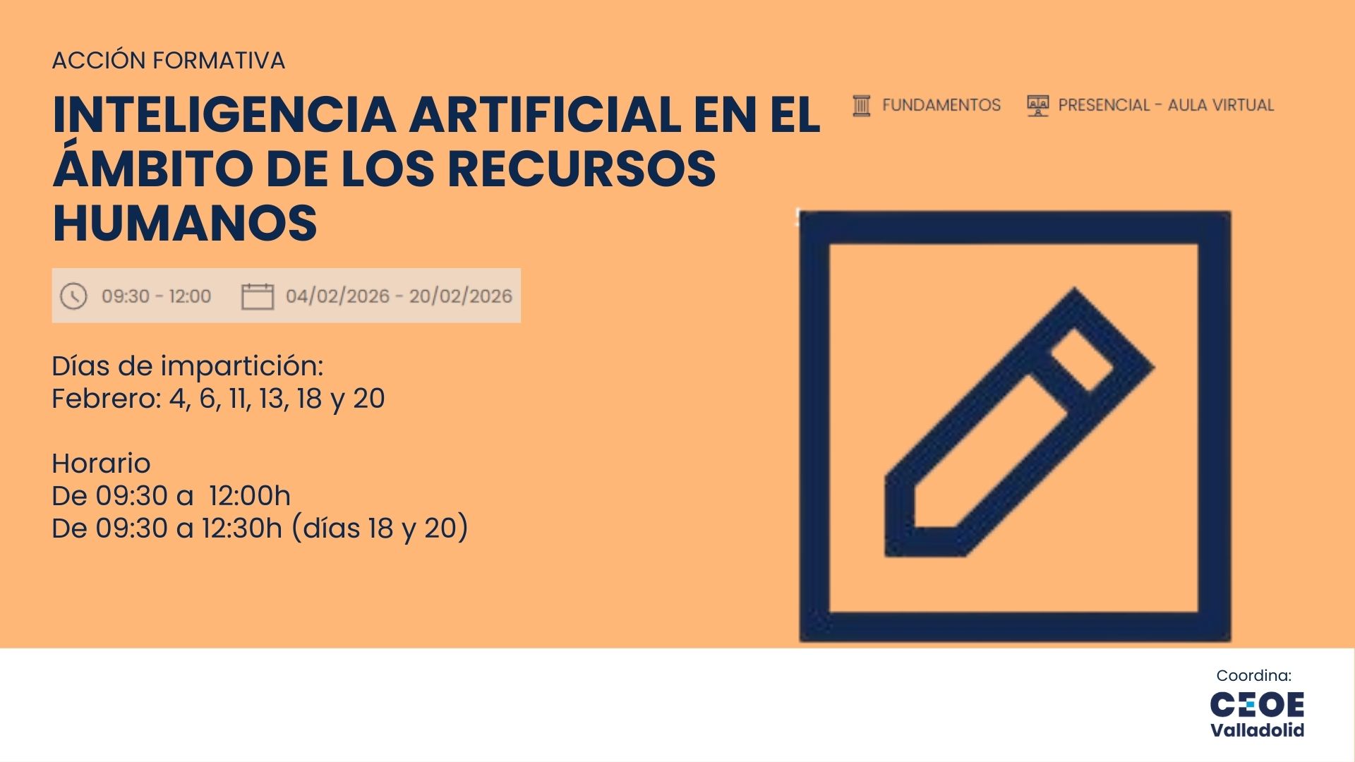 | 159 | 1 | IA en el Ámbito de los RRHH | 16 | 04/02/2026 | 20/02/2026 | 09:30 a 12:00 y 09:30 a 12:30 | Febrero: 4, 6, 11 y 13 (09:30 a 12:00) 18 y 20 (09:30 a 12:30) | https://edene.es/ediciones/159-inteligencia-artificial-en-el-ambito-de-los-recursos-humanos-edicion-1/ | https://solicitudes.ceoe.es/inscripcionoferta-852-inteligencia-artificial-en?idgr=852&medio=edene&utm_content=&utm_medium=&utm_source=&utm_name= |