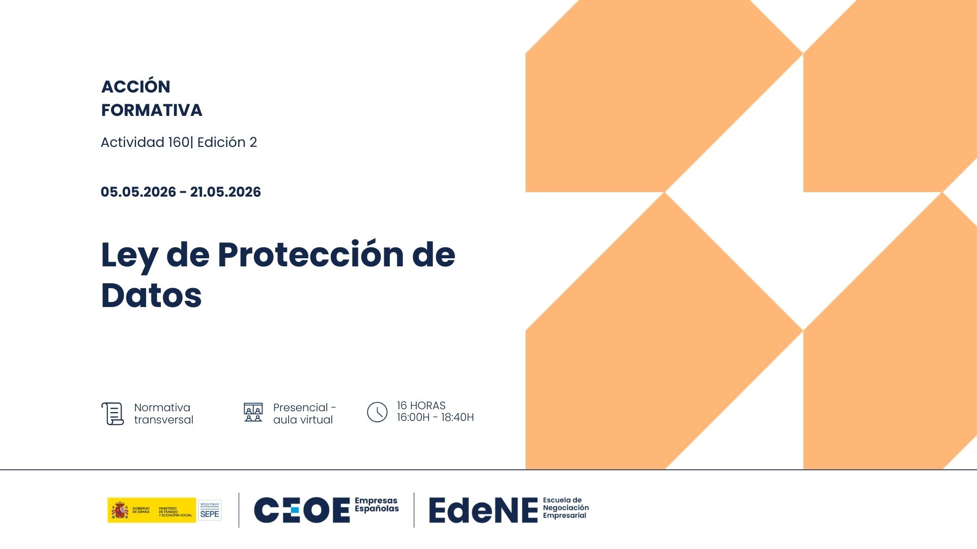 Curso de Ley de Protección de Datos. 24 febrero, 2026 CEOE VA EDICIÓN 2. Información aquí. Solicitud aquí. Información: ACCION: 160 GRUPO: 2 FECHA DE INICIO: 05/05/2026 FECHA FIN: 21/05/2026 HORARIO: 16:00 A 18:40 DIAS DE IMPARTICION: MARTES Y JUEVES: 05-07-12-14-19-21 DE MAYO EDICIÓN 3
