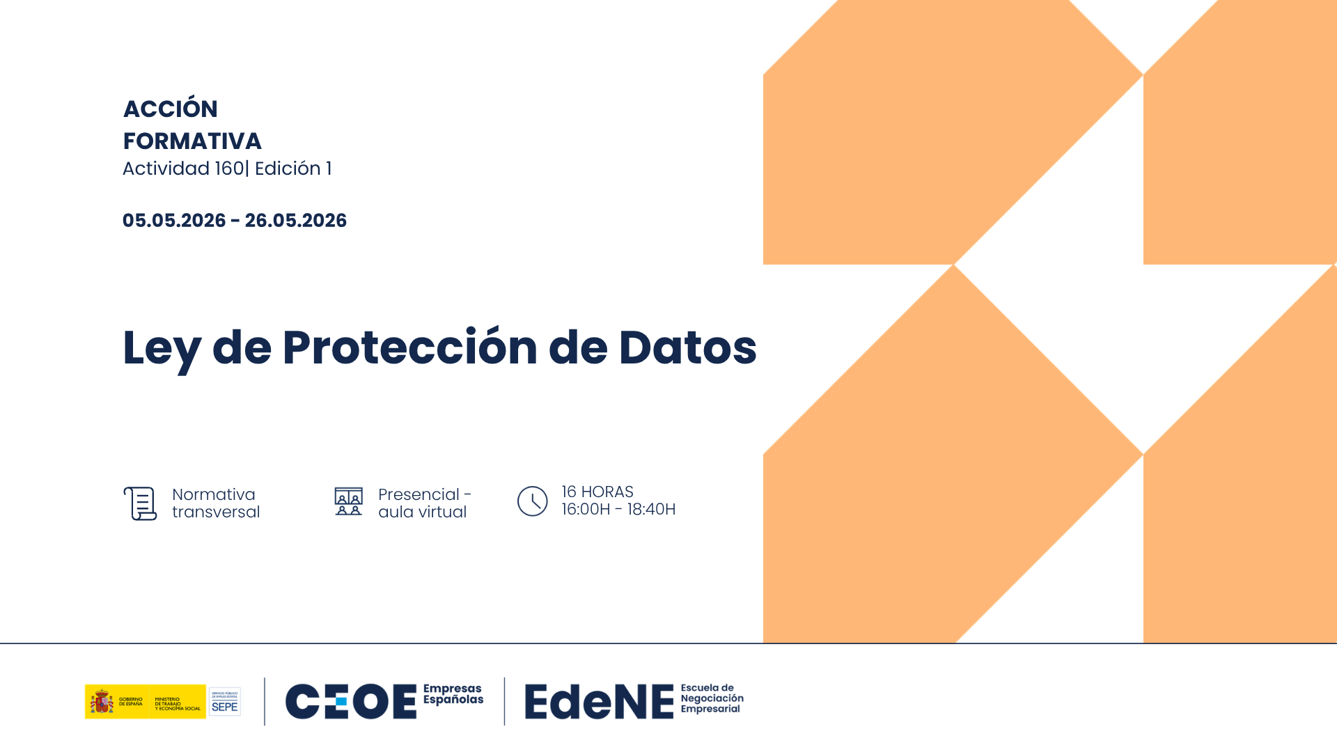 Curso de Ley de Protección de Datos. 24 febrero, 2026 CEOE VA EDICIÓN 1. Información aquí. Solicitud aquí. Información: ACCION: 160 GRUPO: 1 FECHA DE INICIO: 09/06/2026 FECHA FIN: 25/06/2026 HORARIO: 9:30 A 12:10 DIAS DE IMPARTICION: MARTES Y JUEVES: 09-11-16-18-23-25 EDICIÓN 2 EDICIÓN 3
