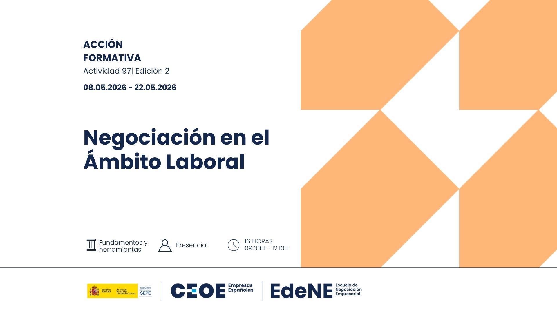 Curso de Negociación en el Ámbito Laboral. 24 febrero, 2026 CEOE VA EDICIÓN 2. Información aquí. Solicitud aquí. Información: ACCION: 97 GRUPO: 2 FECHA DE INICIO: 08/05/2026 FECHA FIN: 22/05/2026 HORARIO: 09:30 A 12:10 DIAS DE IMPARTICION: MAYO: 08-11-12-14-15-22 EDICIÓN 3