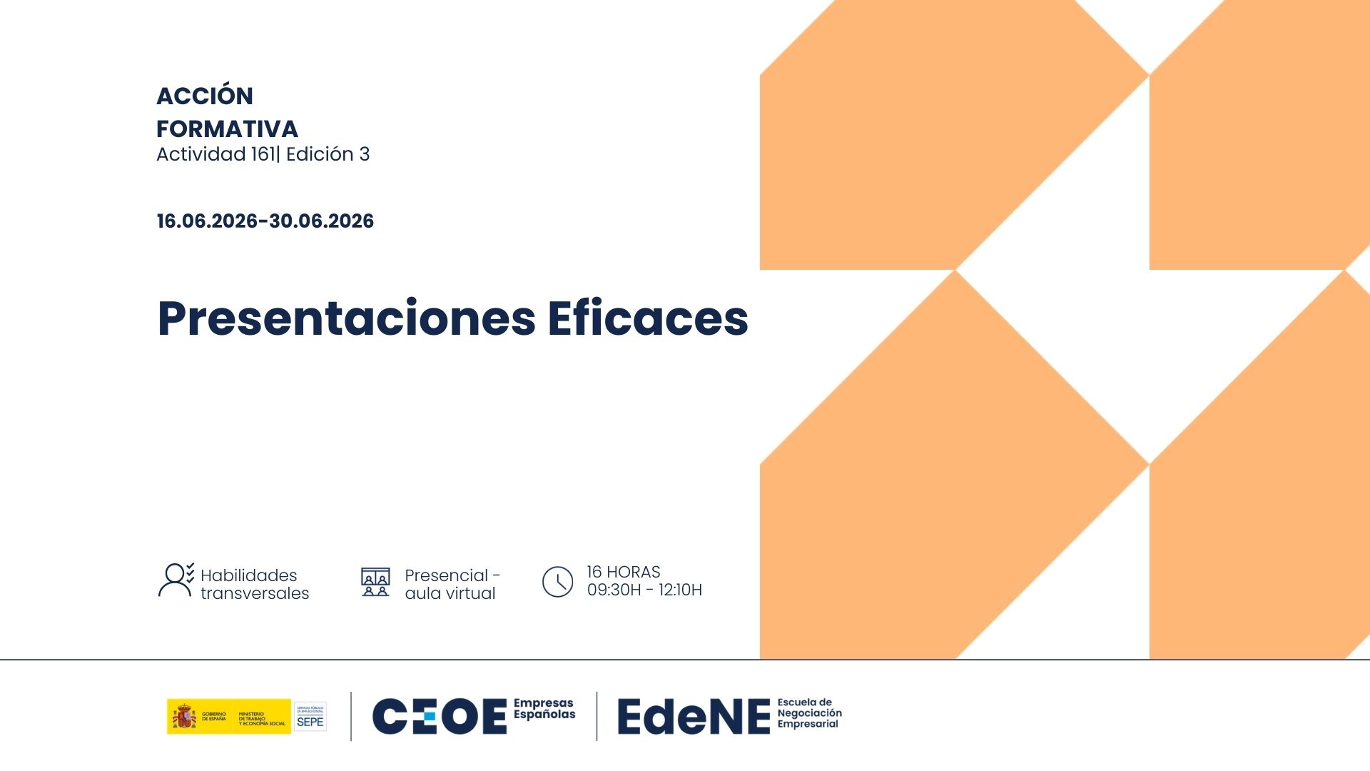 Curso de Presentaciones Eficaces. 23 febrero, 2026 CEOE VA EDICIÓN 3. Información aquí. Solicitud aquí. Información: ACCION: 161 GRUPO: 3 FECHA DE INICIO: 16/06/2026 FECHA FIN: 30/06/2026 HORARIO: 09:30 A 12:10 DIAS DE IMPARTICION: JUNIO: 16-18-23-25-29-30